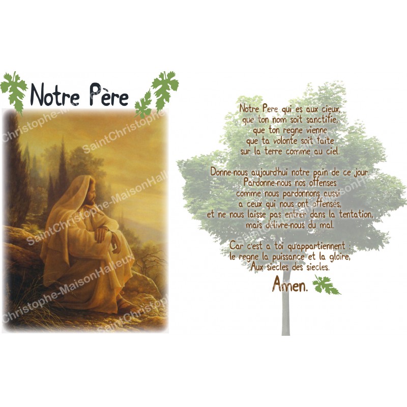 Der Aufkleber zeigt Jesus Christus, der in einer natürlichen Umgebung sitzt, mit dem Vaterunser auf einem pflanzlichen Hintergrund.