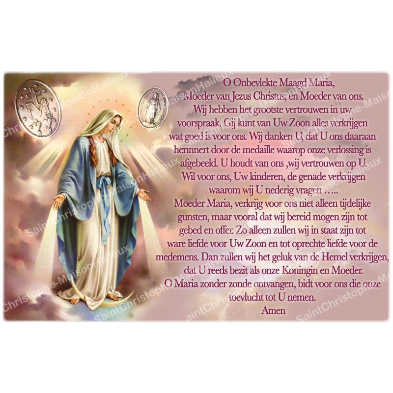 Der Aufkleber zeigt die Heilige Jungfrau Maria und die Wunderbare Medaille mit einem ihr gewidmeten Gebet vor einem Hintergrund aus rosa Wolken.