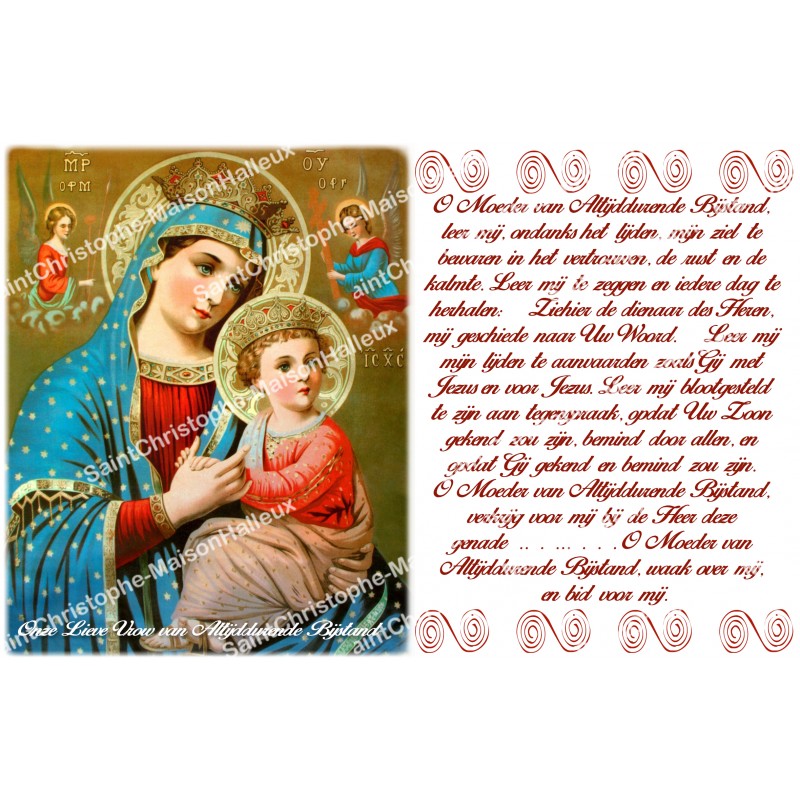 Der Aufkleber zeigt die Muttergottes von der Immerwährenden Hilfe in einem sehr verzierten Stil mit einem ihr gewidmeten Gebet.