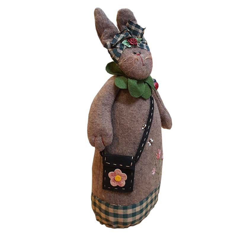 Dekorativer Hase aus Plüschfilz, verziert mit kariertem Stoff. Der Hase steht beschwert aufrecht und trägt eine Tasche mit Blumenmuster.