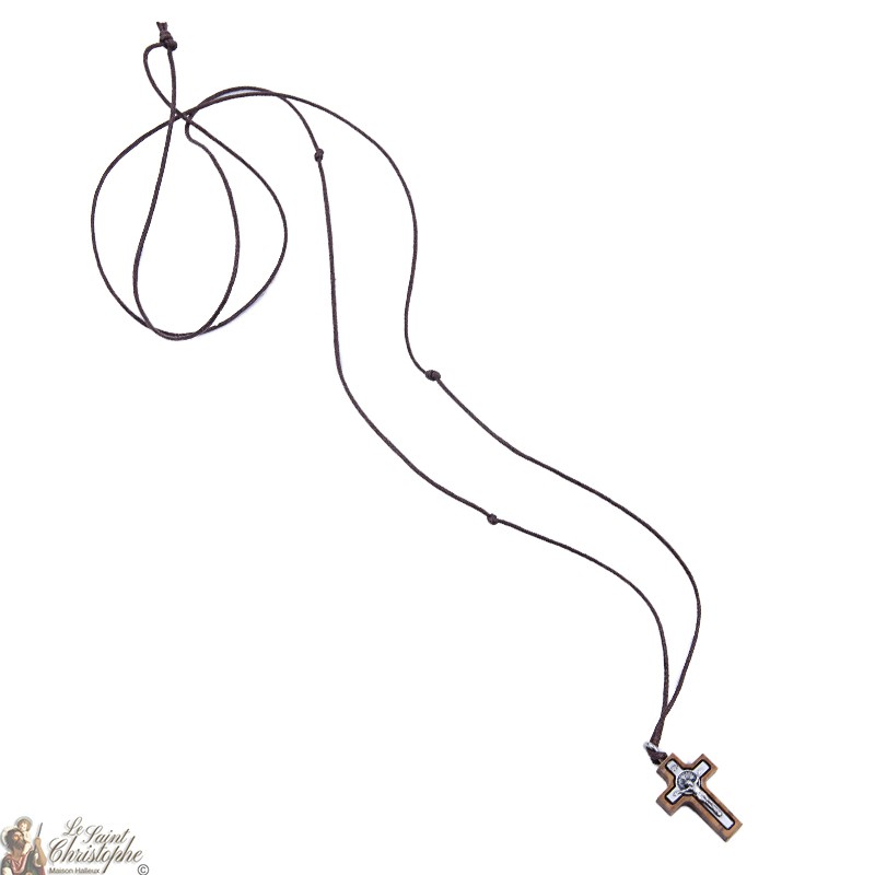 Halskette Schnur mit kleinen Holzkreuz St. Benedict Oliven
