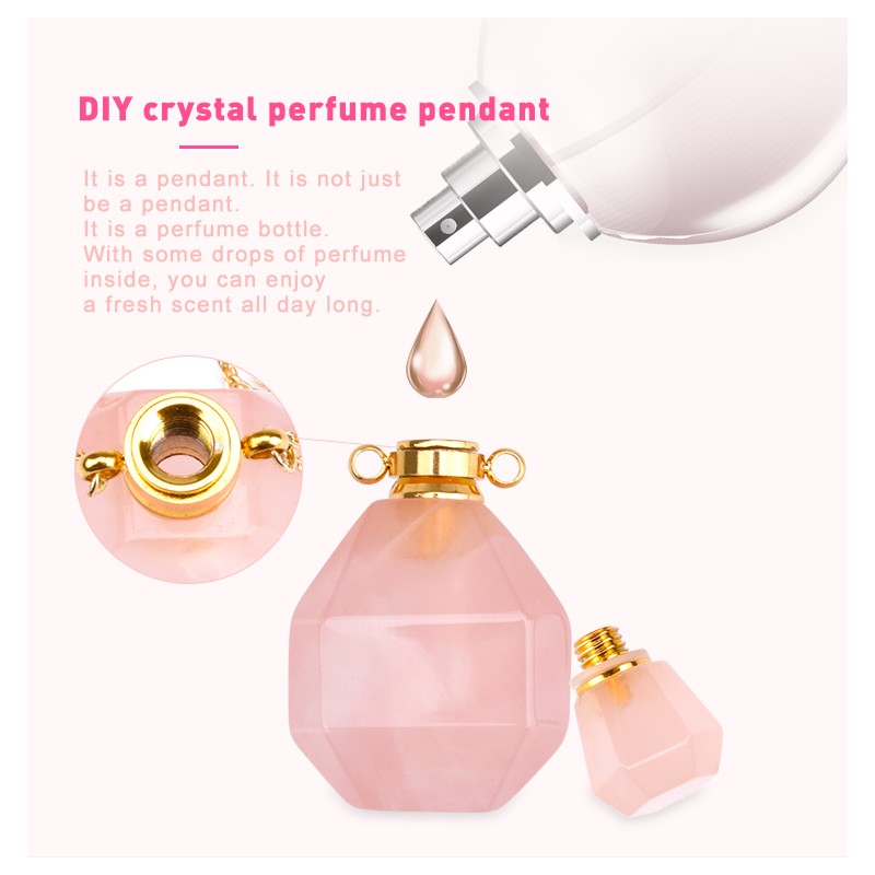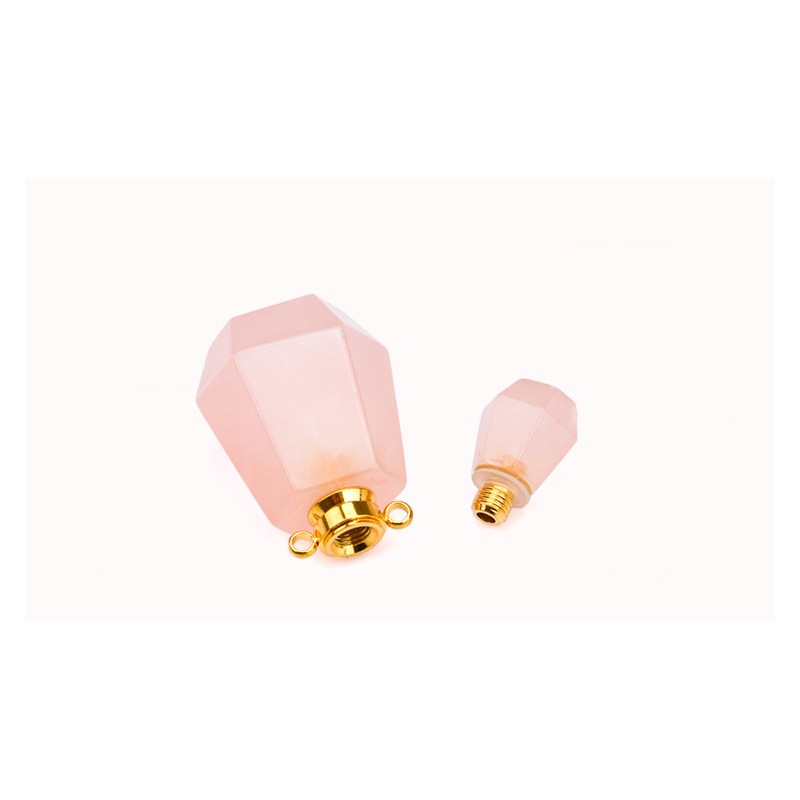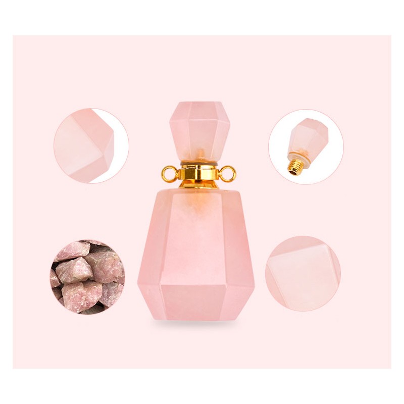Halskette mit Anhänger in Form einer Parfümflasche, aus Rosenquarz. Geben Sie ein paar Tropfen Ihres Lieblingsparfüms hinein und genießen Sie den Tag!