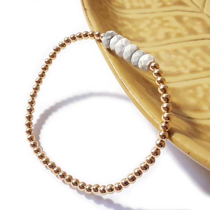 Dieses feine, glänzende, schicke Armband ist perfekt für eine natürliche, gepflegte Stimmung. Die goldenen Perlen sorgen für leuchtenden Pep und bringen die facettierten Howlitperlen zur Geltung.