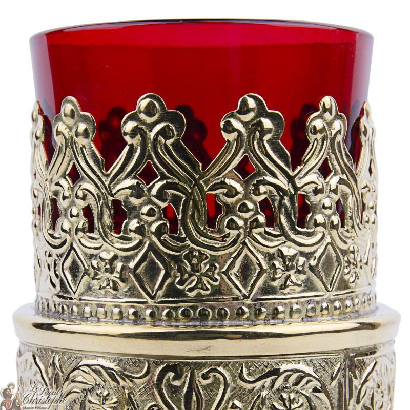Greek oil lamp, also called orthodox oil lamp, with red glass and gilded metal base. Beautifully carved, the oil lamp is a symbol of the Orthodox Christians, representing the Light with which Jesus Christ illuminates our souls. Of modest size, this candlestick can be used in church for ceremonies as well as for decoration, spiritual or personal.