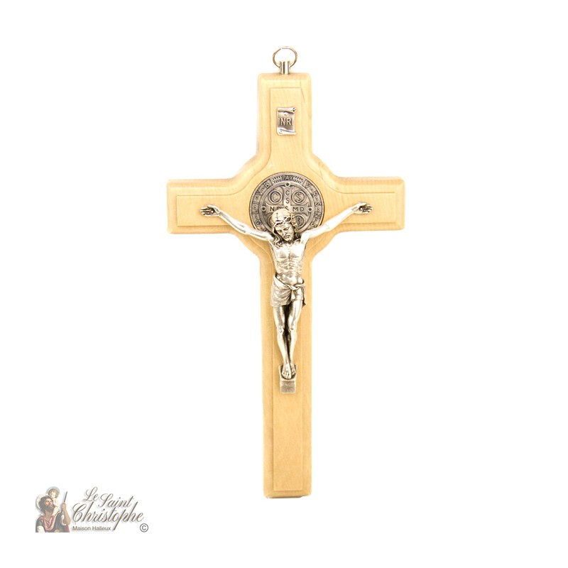 Cross of Saint Benedict in natural wood, carved in a clear and soft wood. The medal of Saint Benedict, the initials INRI and the figure of Christ are in silver plated metal, finely worked. A ring allows to hang the cross.