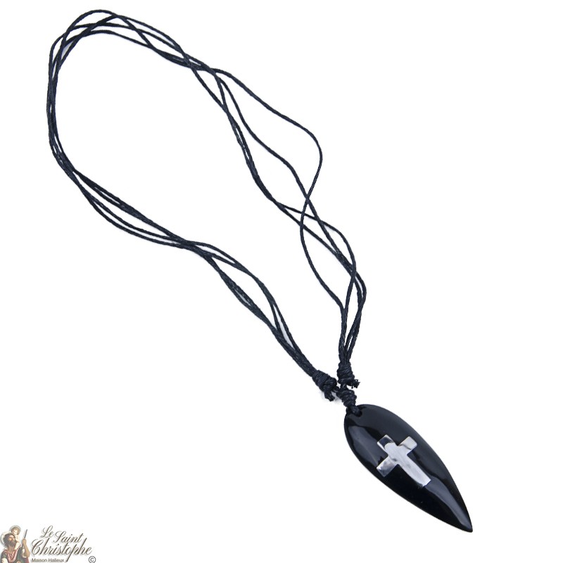Cord pendant with resin surfboard inlaid with metal cross in silver color.