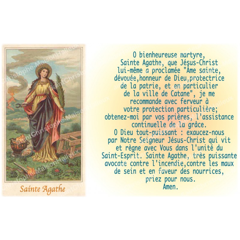 The sticker features an image of Saint Agatha, with a prayer dedicated to her. She is a virgin martyr, protector of Sicily and more specifically of the city of Catania, and patron saint of victims of rape and torture. She is asked for help during eruptions of Mount Etna, natural disasters, fires, and earthquakes, but also for infertility and breast pain.