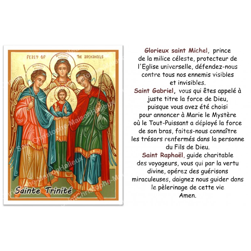 The sticker depicts the Holy Trinity, based on the classic icon of the Feast of the Archangels holding the portrait of Jesus Christ, with a prayer dedicated to him.