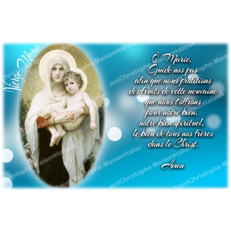 The sticker features an image of the Blessed Virgin Mary holding the Baby Jesus in her arms, with a prayer dedicated to her, on a beautiful blue background.