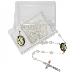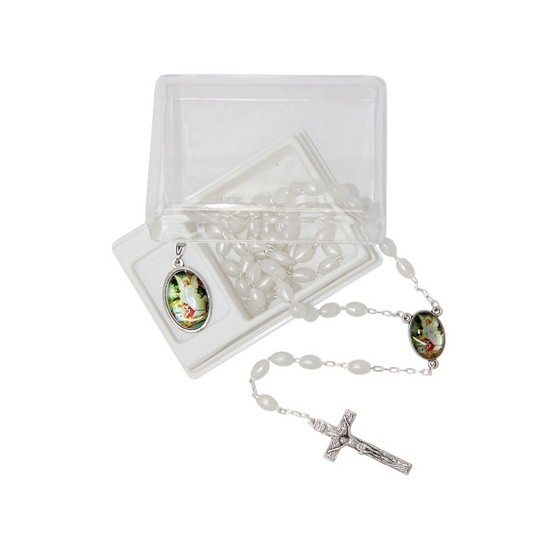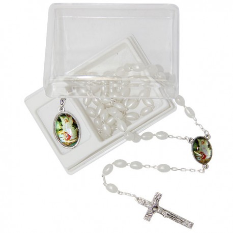 Gift box with silver metal rosary, white pearly pearls and medal. Image of the heart and medal Ange Gardien Medal: 20mm Rosary: 46 cm Pearl: 8mm Weight: 60gr code: 11910-1