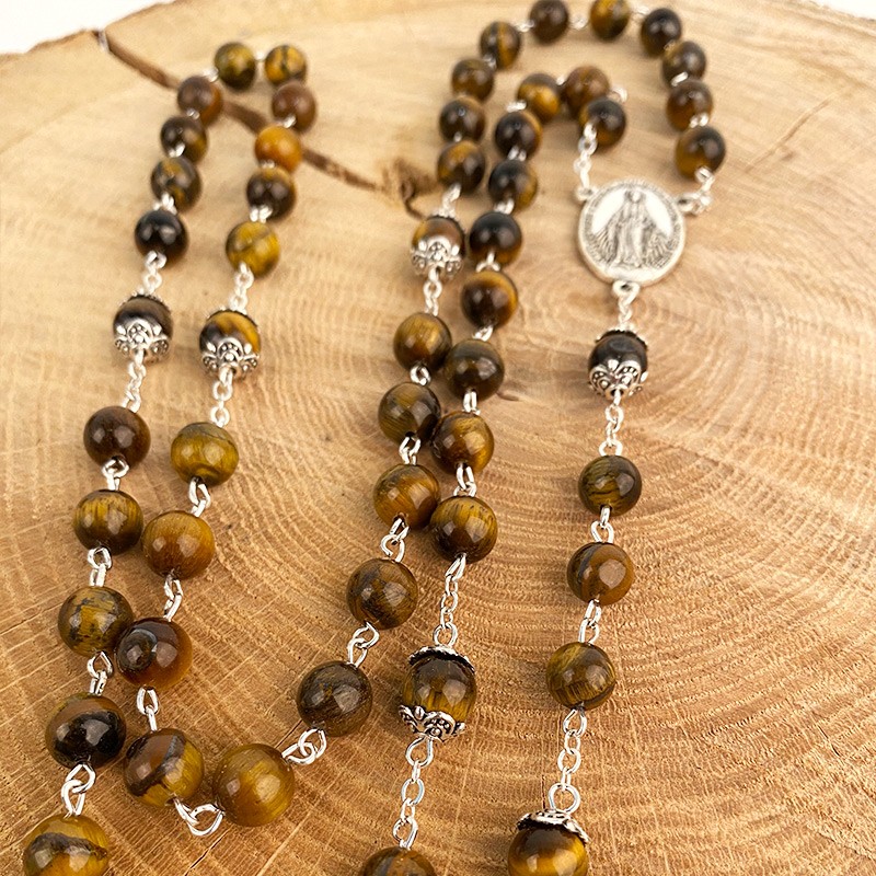 Rosary mounted on silver plated metal chain with fine stone beads tiger eye. The centerpiece is a medal to the miraculous virgin with a Marian symbol at the back. The cross is made of metal and engraved with the name of Jerusalem.