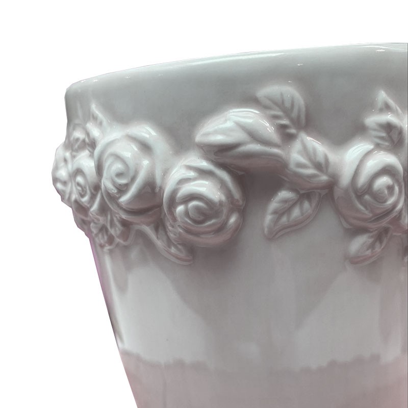 Maceta de cerámica inglesa con el borde decorado con ramos de rosas en toda la circunferencia. De color crema, también está esmaltada.