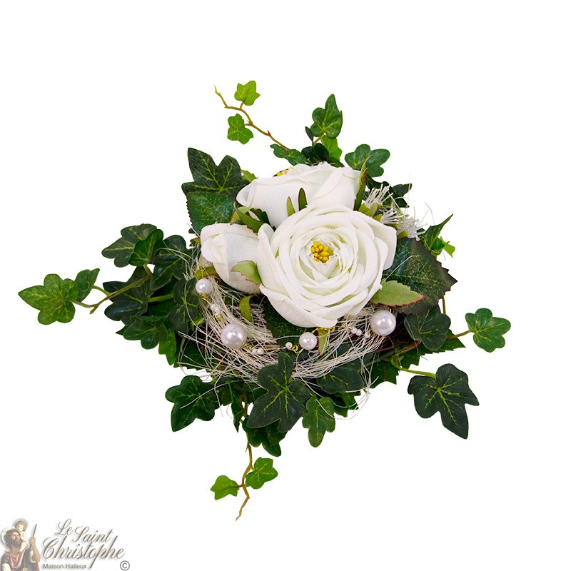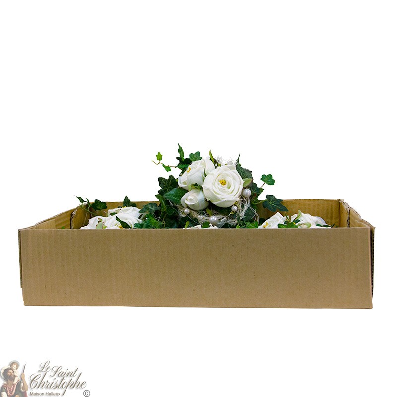 Ramo de flores artificiales compuesto por rosas blancas, hiedra, cintas, cordones, perlas... El ramo forma una corona de flores.