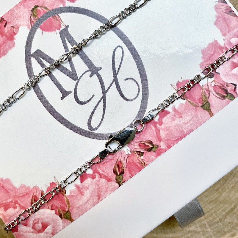 Cadena con eslabones llamados Forçat Figaro en plata 925 rodiada, de 45 cm de largo. Una cadena sofisticada y refinada al mismo tiempo.