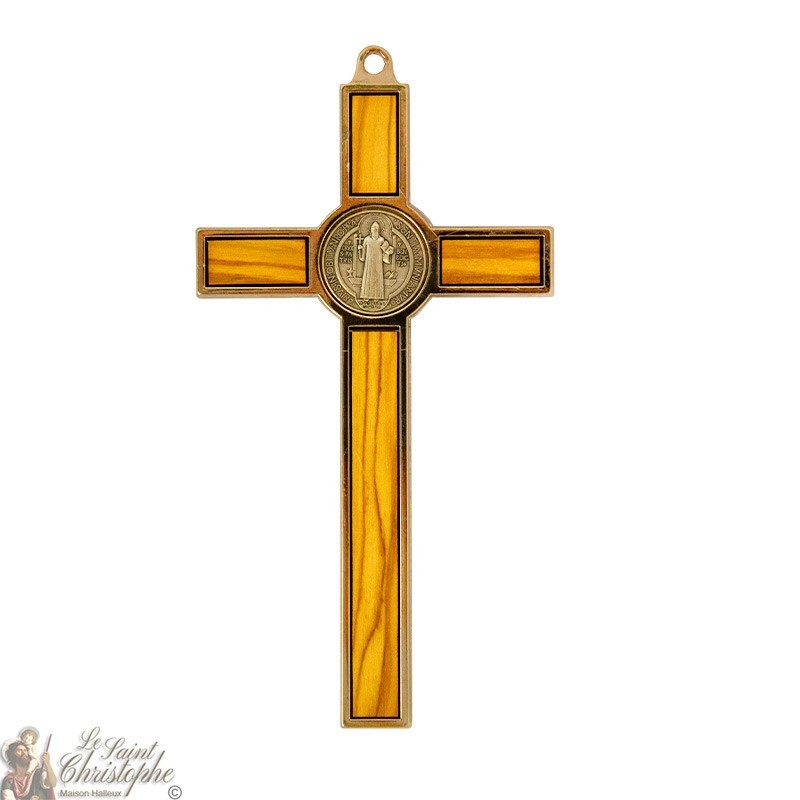 Cruz de San Benito en madera clara con borde de metal. La medalla del Santo y la efigie de Jesucristo están realizadas en metal plateado. Crucifijo colgante.