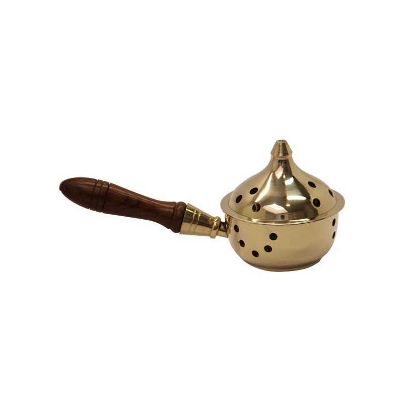 Incensario de cobre en la mano y mango de madera, hecho totalmente a mano.