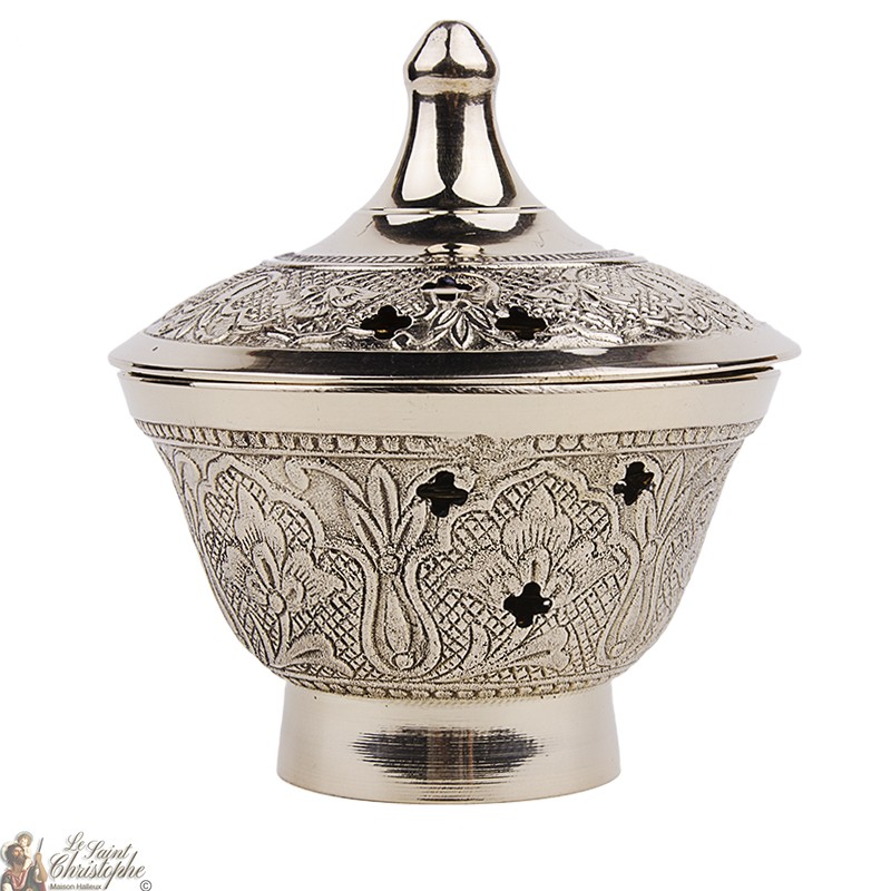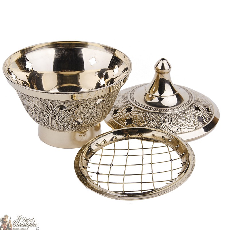 Este incensario de cobre dorado lleva grabado en su superficie un bello friso vegetal y floral. La tapa tiene un agarre alto y fácil. Los orificios están tallados en forma de cruz redondeada. El incensario también contiene una rejilla para colocar los trozos de incienso y los granos.