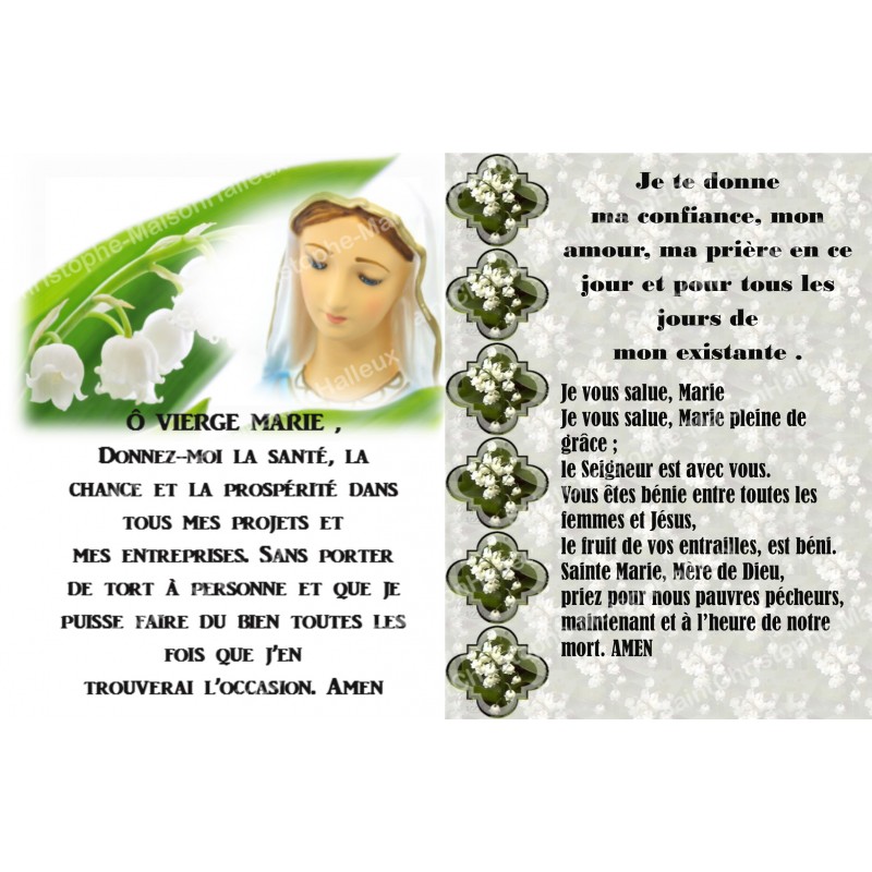 La pegatina tiene la imagen de la Virgen María, rodeada de varios muguetes, con una oración pidiéndole salud, suerte y prosperidad.
