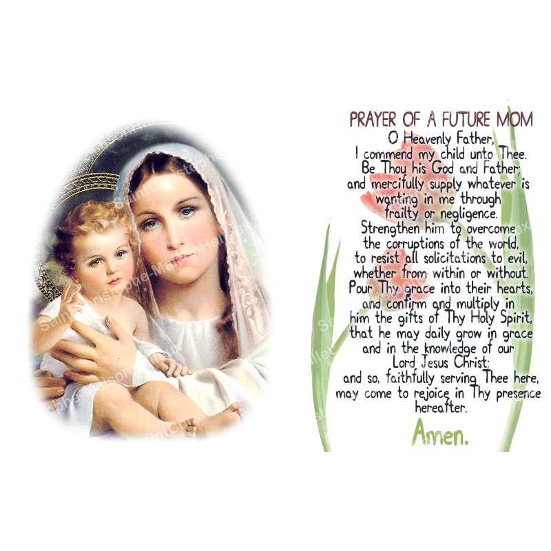 La pegatina representa a la Virgen María sosteniendo al Niño Jesús, con una oración para una futura mamá.
