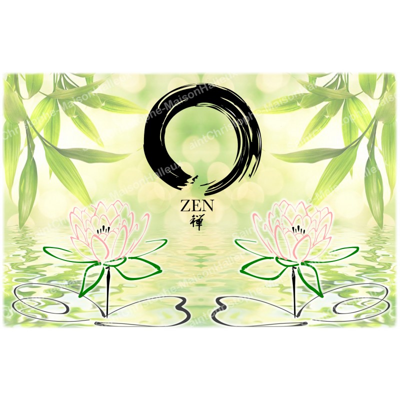 La pegatina está ilustrada con un estanque con dos flores de loto y el símbolo zen.