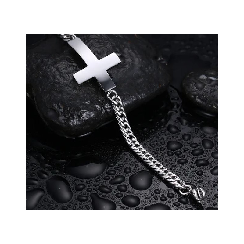 Pulsera sólida con eslabones de cadena de bordillo y una cruz cristiana. Los eslabones gruesos y robustos de este modelo son especialmente apreciados por los hombres que prefieren este estilo más seguro.