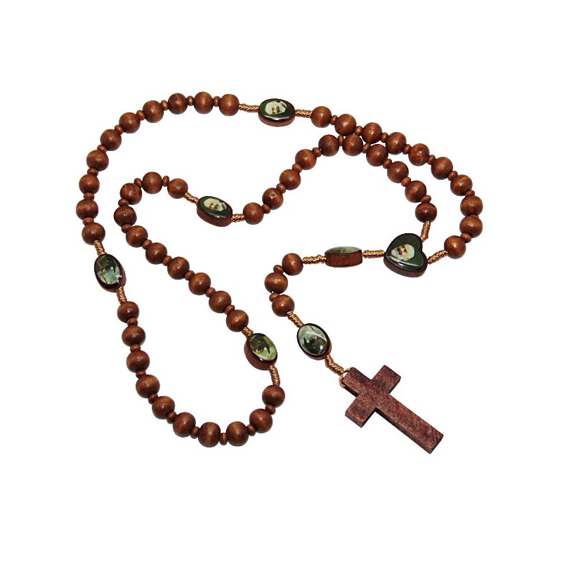Rosario de madera marrón con Santa Rita y Padre Pio
