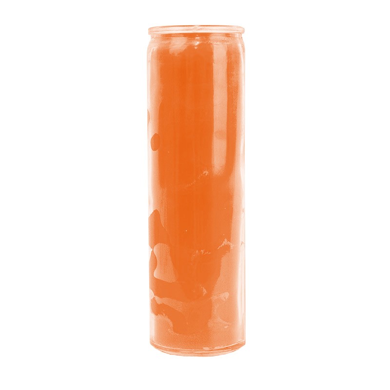 Bougie dans un récipient en verre solide, pouvant brûler durant 168 heures, soit une durée équivalente de 7 jours. La paraffine, d'un bel orange dans toute sa masse, coule à l'intérieur du récipient, donnant un effet photophore lors de la combustion, la flamme brillant au travers de la fine couche de cire. La bougie peut être utilisée pour le simple plaisir de la décoration ou bien pour des usages plus spirituels tels que la prière, la méditation ou l'ésotérisme.