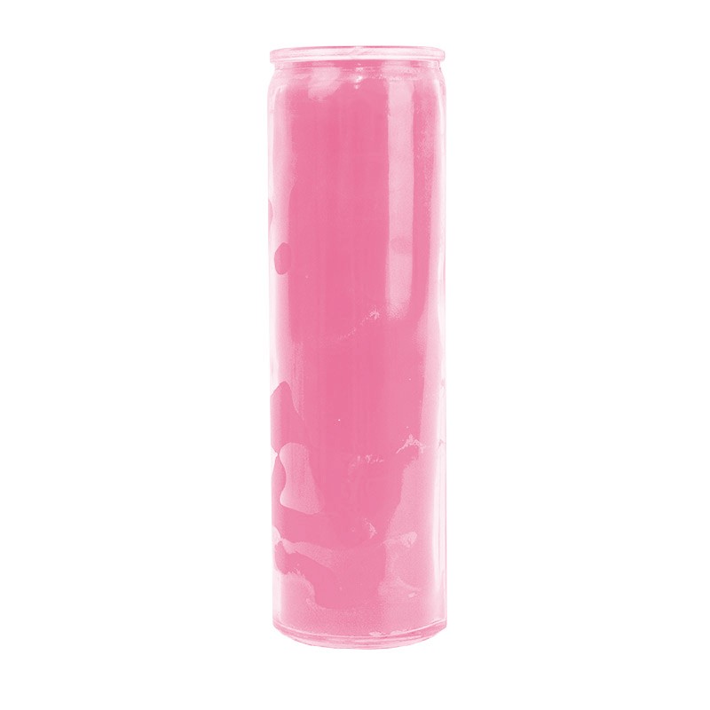 Bougie dans un récipient en verre solide, pouvant brûler durant 168 heures, soit une durée équivalente de 7 jours. La paraffine, d'un beau rose dans toute sa masse, coule à l'intérieur du récipient, donnant un effet photophore lors de la combustion, la flamme brillant au travers de la fine couche de cire. La bougie peut être utilisée pour le simple plaisir de la décoration ou bien pour des usages plus spirituels tels que la prière, la méditation ou l'ésotérisme.