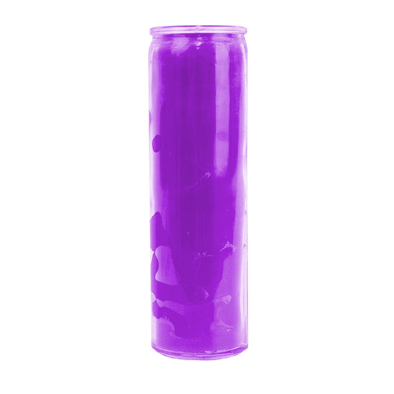 Bougie dans un récipient en verre solide, pouvant brûler durant 168 heures, soit une durée équivalente de 7 jours. La paraffine, d'un beau mauve dans toute sa masse, coule à l'intérieur du récipient, donnant un effet photophore lors de la combustion, la flamme brillant au travers de la fine couche de cire. La bougie peut être utilisée pour le simple plaisir de la décoration ou bien pour des usages plus spirituels tels que la prière, la méditation ou l'ésotérisme.