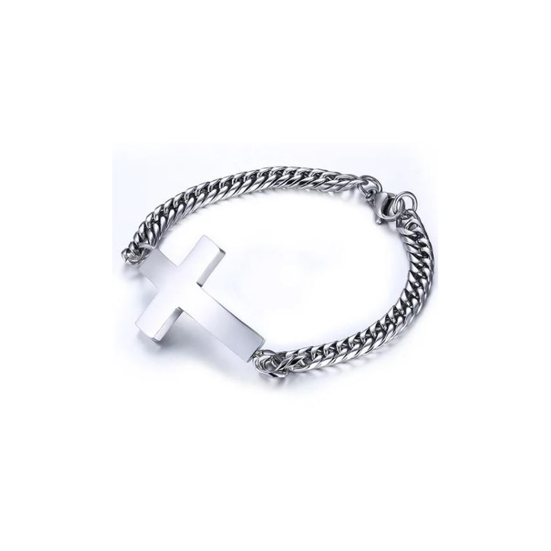 Bracelet massif à maillons de gourmette, avec une croix chrétienne. Les maillons épais et robustes de ce modèle sont particulièrement prisés par les hommes qui préfèrent ce style plus assuré.