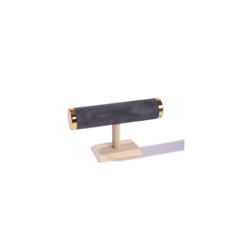 Présentoir à bracelets avec duvet couleur gris et extrémité en doré métallique brillant.