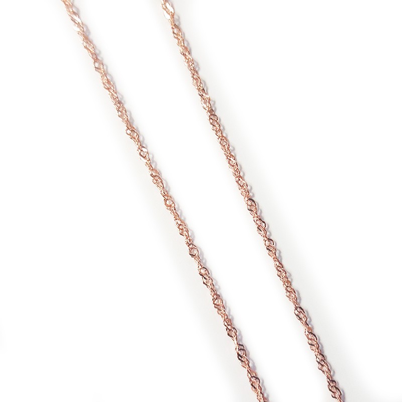 Chaîne Singapour de 45 cm en argent 925 plaqué or rose, reconnaissable à ses maillons entremêlés délicatement. Très confortable, cette chaîne est sophistiquée et chic, se portant seule ou se mariant harmonieusement avec un pendentif.