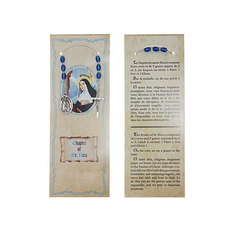 Le chapelet de Sainte Rita dans sa pochette avec la prière en Français et Anglais.