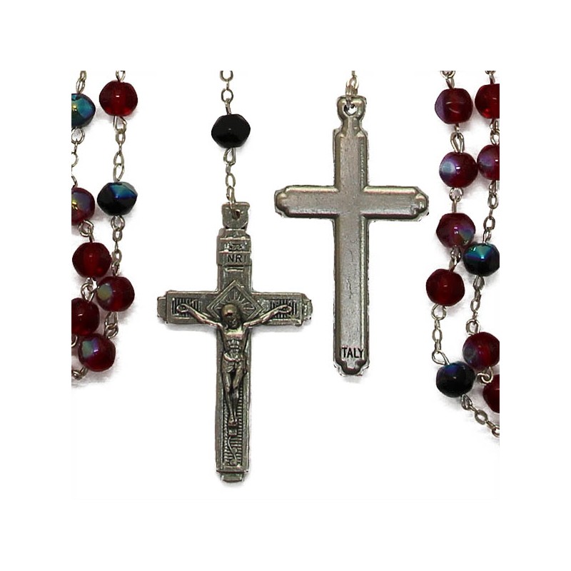 Ce chapelet aux perles en verre est monté sur une chaîne en métal argenté. La plupart des perles sont d'un rouge vermillon intense et irisé, certaines sont d'un bleu irisé. La croix du Christ est finement ciselée et décorée, de même que la médaille à la Sainte Vierge. La médaille est notée d'un Ave Maria au dos. C'est un très bel outil de prière.
