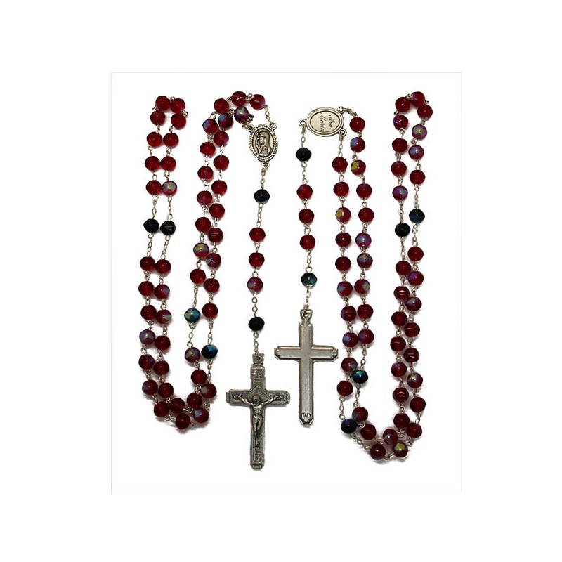 Chapelet à perles rouge irisé multicolore en verre à facettes, montées sur une chaîne en métal argenté. La médaille est frappée du visage de la Sainte Vierge et d'un Ave Maria.