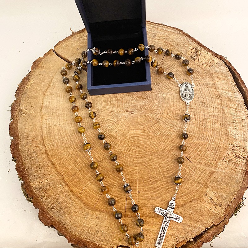 Chapelet monté sur chaîne en métal argenté, avec perles en œil de tigre. Pierre fine délicate, l'oeil de tigre est un minéral aux couleurs brun et ocre et aux reflets jaunes flamboyants et magnifiques. La médaille centrale du chapelet est dédiée à la Vierge Miraculeuse avec la mention "Ô Marie, conçue sans péché, priez pour nous qui avons recours à vous". Le dos de la médaille est frappé d'un symbole marial. La croix finement sculptée avec les traits de Jésus, pendentif de ce chapelet, est gravée au dos avec la mention Jérusalem. Le tout est conservé dans une belle boîte à l'intérieur de velours noir.