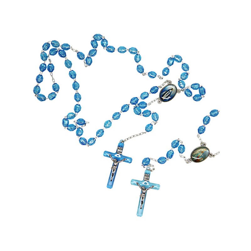 Chapelet en résine plastique bleu avec la Vierge Miraculeuse et l'apparition de lourdes