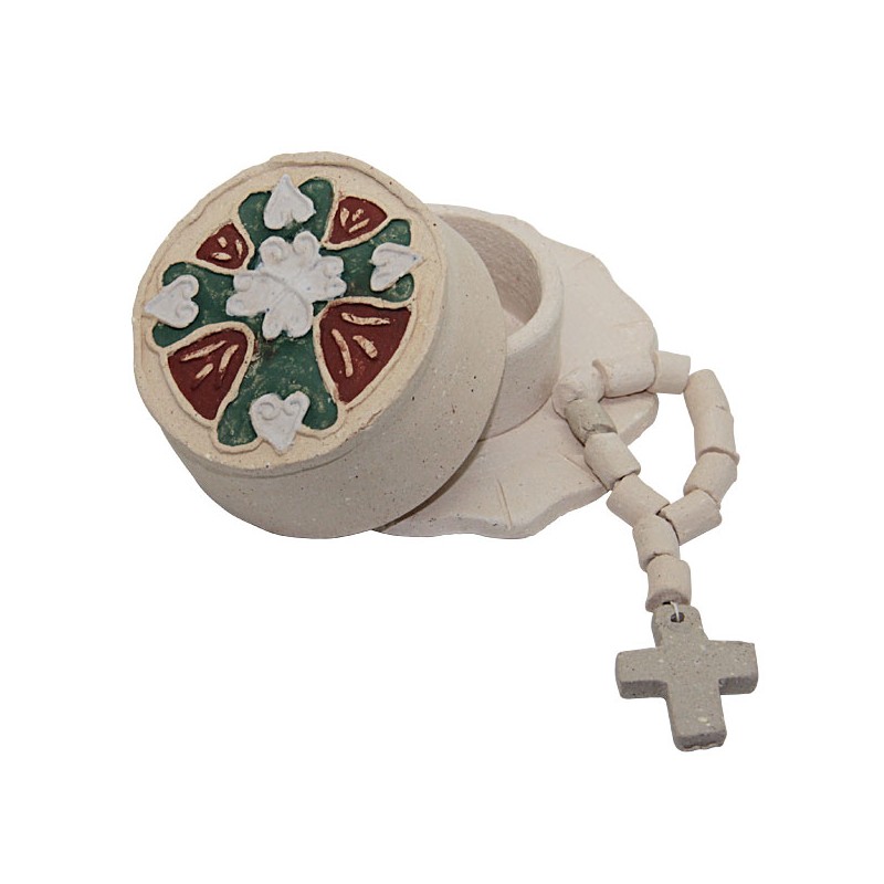 Très jolie boite en Terre cuite avec croix moderne et dizaine également en Terre cuite de couleur naturel .