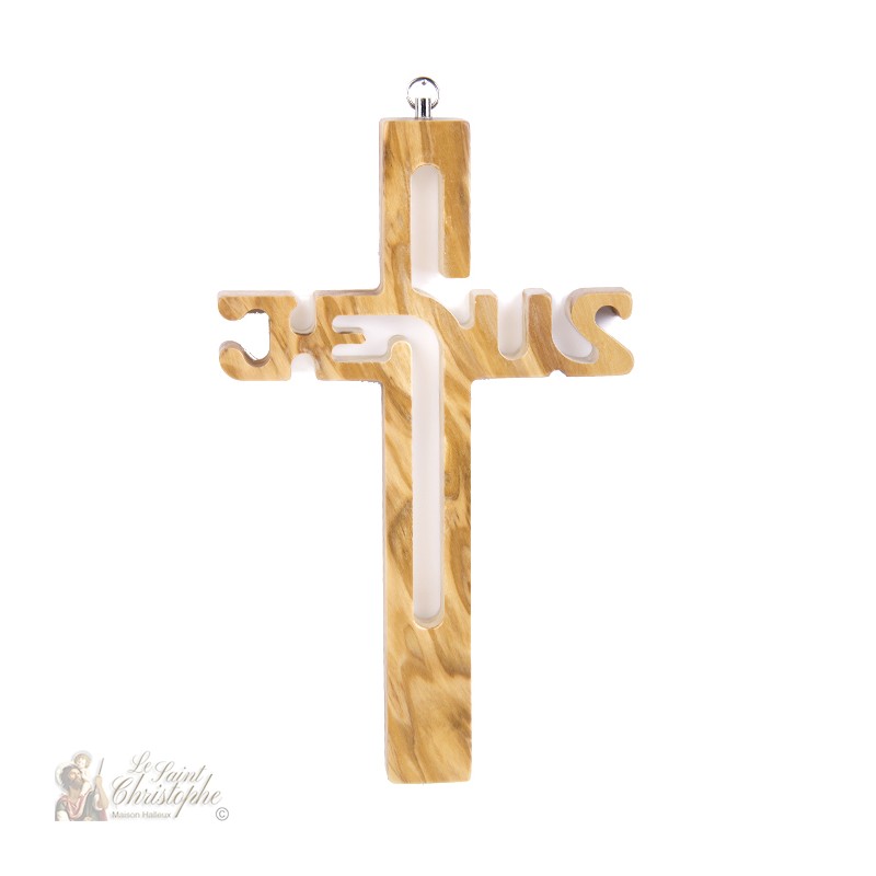 Croix bois sculptée avec texte jesus