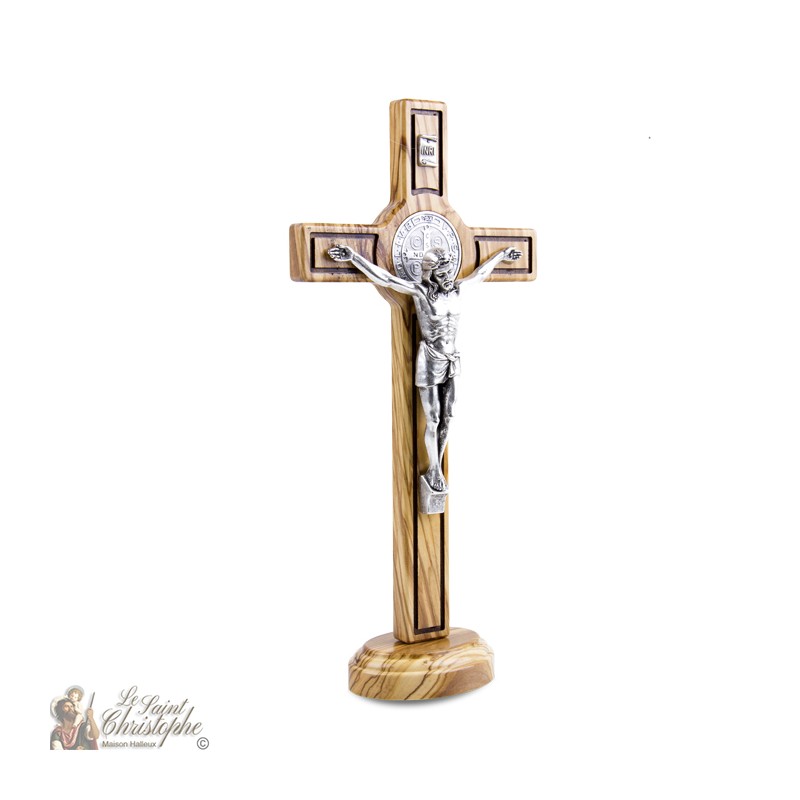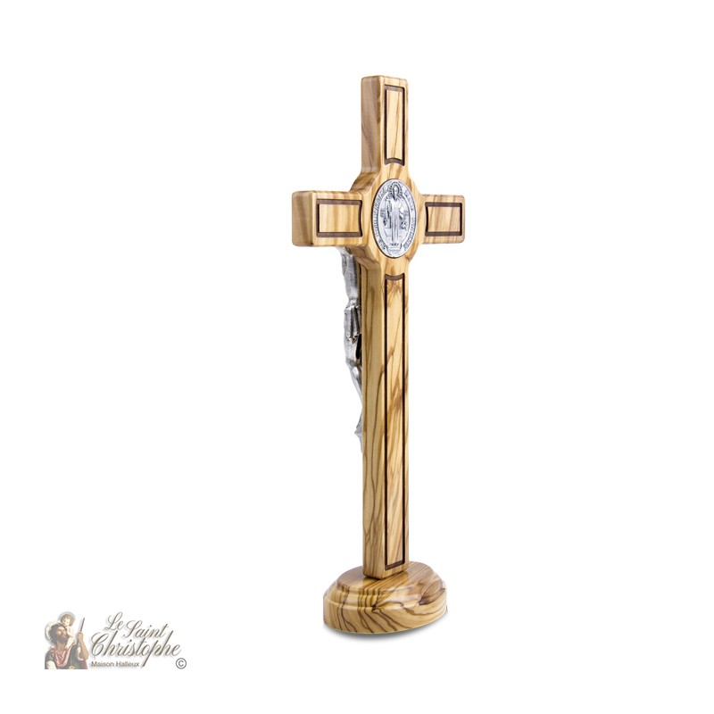 Croix Saint Benoit en bois d'olivier - 30cm - sur base