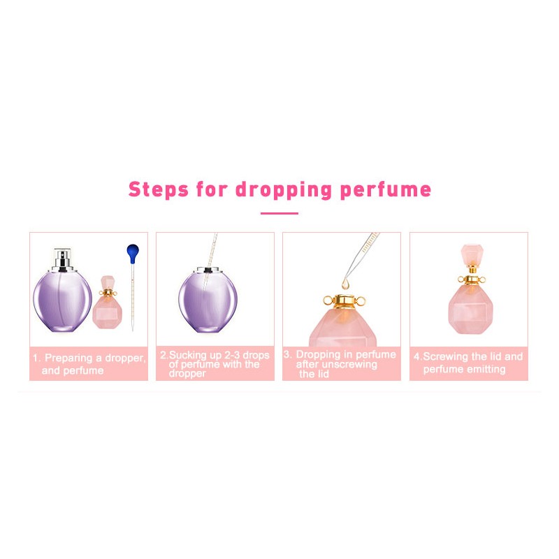 Ce collier allie originalité, bien-être et beauté ! Réalisé dans du quartz rose, pierre de l'Amour Inconditionnel pour soi et les autres, la petite bouteille de parfum qui sert de pendentif permet d'y déposer quelques gouttes de votre parfum préféré. La pipette fournie facilite le transfert du liquide d'une bouteille à l'autre sans problème. Si vous désirez laisser le parfum s'échapper un peu plus fort de la bouteille, retirez la petite languette en silicone sous le bouchon.