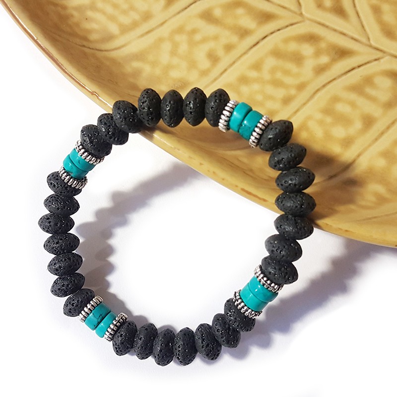 Ce bracelet au charmant style bohème est composé de pierres de lave ovales et de turquoises cylindriques, agrémenté de quelques petites perles argentées pour mettre le bleu des turquoise en valeur. La pierre de lave, noire et poreuse, est capable de contenir quelques gouttes d'huile essentielle ou de parfum, qu'elle diffusera tout au long de la journée.