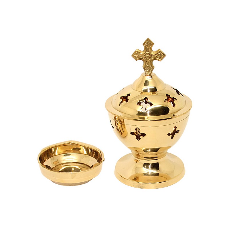 Encensoir cuivre, très belle finition en 3 parties, couvercle, récipient intérieur pour le charbon, et socle avec croix sculptées.