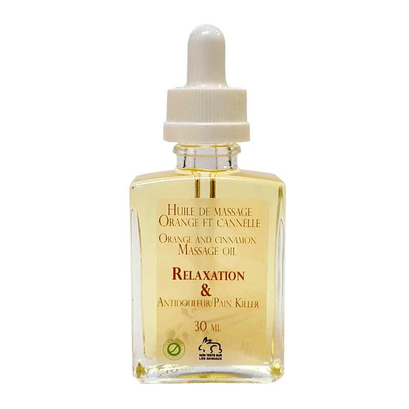 Outre sa délicieuse fragrance, l'huile de massage orange-cannelle, est utile pour soulager les douleurs lorsqu'elle est appliquée sur la peau et que l'on malaxe doucement les muscles endoloris. Relaxante, l'huile nourrit aussi la peau en profondeur.