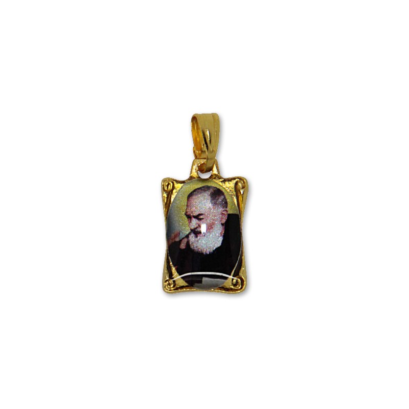 Médaille de Padre Pio en émail transparent et métal doré, sans nickel. Ce petit pendentif fantaisie est rectangulaire. Le recto est à l'image de Saint Padre Pio, légèrement irisée, recouverte d'une couche d'émail protecteur avec effet brillant. Padre Pio est un saint que l'on peut prier pour toute demande, il réalise beaucoup de miracles.
