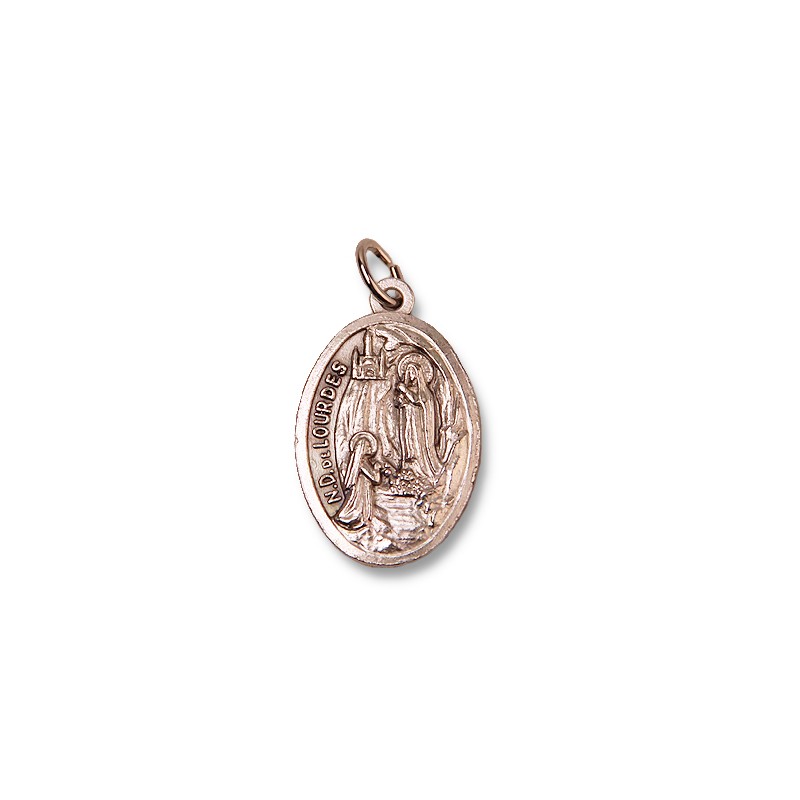 Médaille de Notre Dame de Lourdes en métal argenté. Ce pendentif fantaisie est de forme ovale. Au recto, on y voit le portrait de la Sainte Vierge, auréolée de lumière, le visage serein. Le verso est à l'image de l'apparition de Marie à Lourdes devant de Bernadette Soubirou.