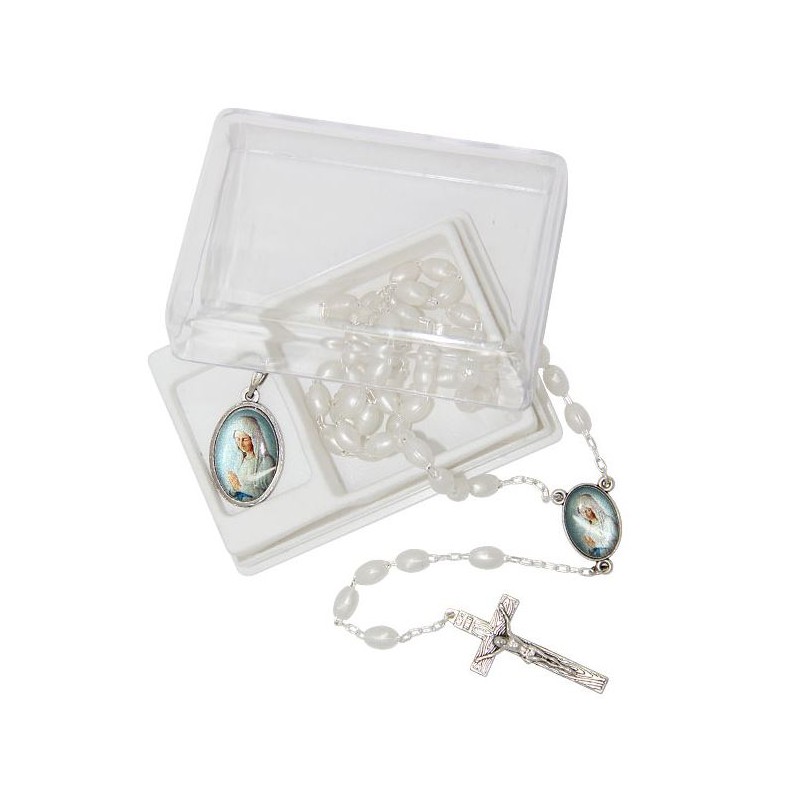 Boite cadeau avec chapelet en métal de couleur argenté,perles blanches nacrées et médaille.