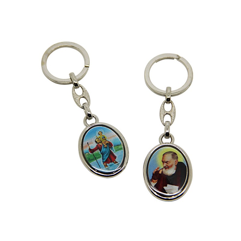 Porte-clés en métal argenté double face - Saint Christophe et Padre Pio - Pater Pio - Ovale