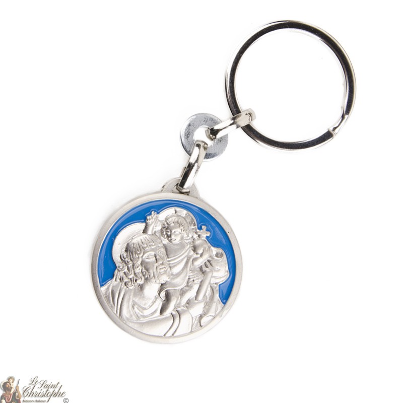 Porte-clés de Saint Christophe en métal argenté et émaillée bleue