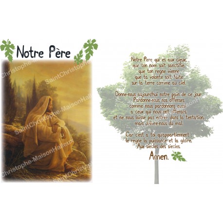 L'autocollant est à l'image de Jésus Christ, assis dans un décor naturel, avec la prière du Notre Père sur fond végétal.